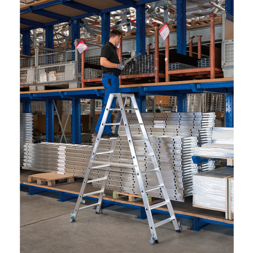 Mycket stabil, inbyggd 4 hjul.80 mm djupa stegpinnar.Finns i 10 höjder: 0,67 - 3,25 m.15 års kvalitetsgaranti.Original pris 6 221,00 kr - Original pris 14 660,00 krOriginal pris6 221,00 kr 14 660,00 kr6 221,00 kr - 14 660,00 krNuvarande pris 6 221,00 kr| /Mycket stabil och lättanvänd dubbelsidig trappstege i aluminium. Inbyggd 4 st självlåsande fjäderbelastade hjul (Ø 80 mm). Starka gångjärn i toppe...
